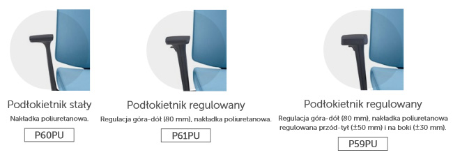 P59PU - Podłokietnik regulowany góra-dół (80 mm), nakładka przód-tył (+/- 50 mm), nakładka regulowana na boki (+/- 30 mm). Kolor stelaża podłokietnika: czarny.